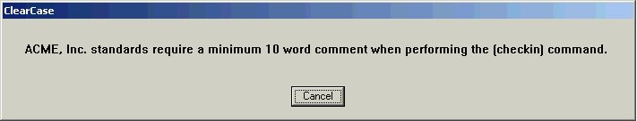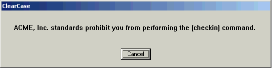 This ClearTrigger Region Name will show up in many ClearTrigger policy dialogs in the region that your ClearCase users will see for example with a Region Name of "ACME Inc." ClearTrigger dislogs displayed when users attempt to violate policy may result in display of a dialog like any below: